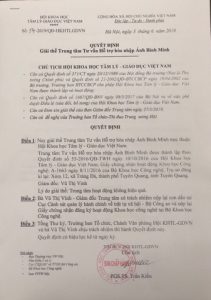 Hội Khoa học Tâm lý giáo dục Việt Nam thông báo giải thể Trung tâm Tư vấn Hỗ trợ hòa nhập Ánh Bình Minh tại Quyết định số: 54-2019 QĐ-HKHTLGDVN ngày 03 tháng 06 năm 2019 do Chủ tịch Hội Trần Kiều ký.