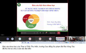 Có 10 báo cáo phát biểu và tham luận tại hội thảo. Đó là báo cáo của TS. Lương Minh Chung, Trường Cao đẳng Dầu khí về “Công tác giáo dục hướng nghiệp và phân luồng học sinh trong bối cảnh hiện nay”. Báo cáo của ThS. Lê Phước Triều, Trường Cao đẳng Kỹ thuật Công nghệ tỉnh về “Giáo dục hướng nghiệp và phân luồng học sinh sau trung học”. Báo cáo của ThS. Nguyễn Thị Sông Thương, Trường THCS Nguyễn An Ninh, Vũng Tàu với chủ đề “Trường THCS Nguyễn An Ninh với hoạt động tư vấn hướng nghiệp học sinh phổ thông trong bối cảnh chuyển đổi số”. Thạc sĩ Trần Thu Hiền, Trường Cao đẳng Sư phạm tỉnh báo cáo tham luận với nội dung “Sử dụng trắc nghiệm sở thích trong tư vấn hướng nghiệp cho học sinh THCS”. Cô giáo Lê Trần Mộng Thành, Trường THCS Phạm Hữu Chí, Long Điền với tiêu đề “Sử dụng Công nghệ thông tin trong việc hướng nghiệp cho học sinh phổ thông hiện nay”. GS.TS. Nguyễn Ngọc Phú, Phó chủ tịch kiêm Tổng Thư ký Hội Khoa học Tâm lý- Giáo dục Việt Nam cũng tham gia báo cáo tại Hội thảo với nội dung “Chuyển đổi số giáo dục và vấn đề nâng cao chất lượng giáo dục-đào tạo trong các nhà trường phổ thông hiện nay”. Cô giáo Vũ Thị Thanh, Trường THPT Bà Rịa với tiêu đề “Tăng cường giáo dục hướng nghiệp và định hướng phân luồng cho học sinh THPT”. TS. Mai Trương Huy, Trường THPT Phú Mỹ đã trình bày về Những đề xuất trong đổi mới giáo dục hướng nghiệp và tư vấn nghề nghiệp cho học sinh THPT hiện nay. Báo cáo về “Giải pháp nâng cao chất lượng giáo dục, đào tạo gắn với hoạt động hướng nghiệp, phân luồng học sinh phổ thông trong Trường THPT Nguyễn Huệ” do cô Nguyễn Thu Hà, Trường THPT Nguyễn Huệ trình bày. Trần Thị Mỹ Thắm, cô giáo Trường THCS Lê Quang Cường, Bà Rịa đã báo cáo về nội dung “Quản lý giáo dục hướng nghiệp cho học sinh trường THCS”.